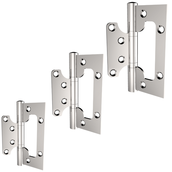 Dobradiça de sobrepor em aço inox com rolamento. Não precisa de rebaixo ou entalhe na porta e no batente.